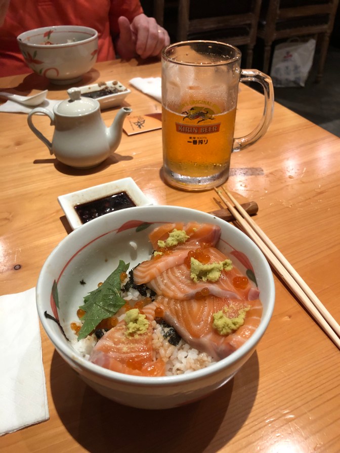 After that we wandered the mall looking for dinner. We ended up at a Japanese themed restaurant, where we got a bowl of warm rice covered in slices of outstanding salmon sashimi. The meal was just right, a fairly light and delicious meal accompanied by a glass of Kirin beer on draft.